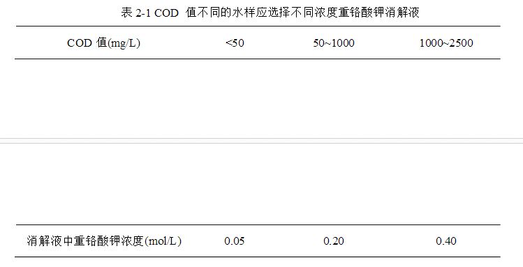 測定地表水、工業(yè)廢水(包括高鹽廢水)、生活污水的化學(xué)需氧量。根據(jù)水樣化學(xué)需氧量值得的不同,在消解時應(yīng)選擇不同濃度的重鉻酸鉀消解液進(jìn)行消解。參考表2-1選擇消解液。