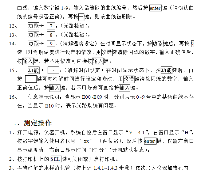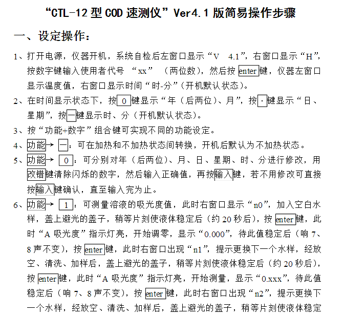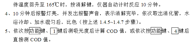 COD快速測定儀(TL-1A) 1.2.2 分光光度計(jì)(721) 1.2.3 水浴塑料盆 1.2.4 14ml專用刻度試管及試管架(若干) 1.2.5 1.00ml專用刻度吸管(2只) 1.2.6 5.00ml專用刻度吸管(2只) 1.2.7 吸耳球 1.3 試劑 1.3.1 專用氧化劑 1.3.2 專用催化劑 1.3.3 氯掩蔽劑:稱取20g硫酸汞溶于1:10稀硫酸中,定容**100ml,