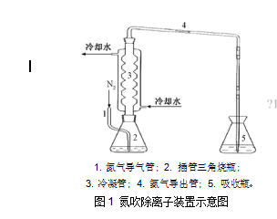子轉化為氨氣,通過氮氣的吹送,將溶液中的氨氣導入硼酸溶液吸收。樣品瓶上端安裝循環冷卻水裝置,防止部分低沸點有機物揮發。