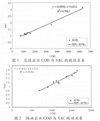 UV254是水樣在 254nm處的紫外吸光值, 利用其和水樣 COD的相關性 , 間接反映水體中一類有機物的含量。隨著水中懸浮物質(zhì)的去除, 濁度降低, 水樣的 UV254 和 COD的線性相關系數(shù)逐漸提高。如果水樣混濁, 可采用 0.45um的濾膜對水樣進行過濾處理 ,這樣處理的缺點在于水樣中的有機物若是以顆粒形態(tài)存在或附著在顆粒表面, 經(jīng)過濾后會引起測定的偏差。 SAC為水樣在 254nm和365nm波長下紫外吸光值的差值, SAC方法的優(yōu)點在于用 365nm波長下吸光值來修正濁度的影響。 UV254 、SAC作為 COD測定的替代指標有一定的局限性, 只適合于濁度低、的連續(xù) 3個月的監(jiān)測數(shù)據(jù), 數(shù)據(jù)分析見圖 1。表 5 為克石化公司工業(yè)水車間隔油出水 UV254 和 COD 的連續(xù)監(jiān)測數(shù)據(jù) , 數(shù)據(jù)分析見圖 2。從分析結果來看 ,相關性是比較理想的。