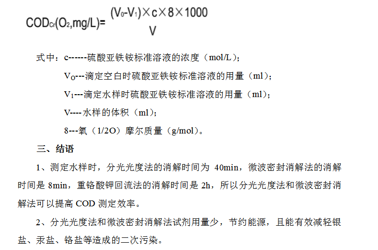 微波密封快速法和重鉻酸鉀回流法一樣,采用硫酸—重鉻酸鉀消解體系,在硫酸銀催化下,采用2450MHz的電磁波(微波)來(lái)加熱反應(yīng)液,采用密封消解方式使消解罐內(nèi)部壓強(qiáng)迅速提高到203kPa,在高溫高壓下達(dá)到快速消解的目的。消解后過(guò)量的重鉻酸鉀用硫酸亞鐵銨標(biāo)準(zhǔn)溶液回滴,以試亞鐵靈為指示劑,根據(jù)硫酸亞鐵銨的消耗量計(jì)算出COD值。