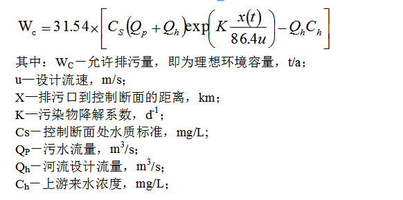 COD屬于可降解污染物用一維模型計(jì)算理想環(huán)境容量,對(duì)于點(diǎn)源排放,令混合后水質(zhì)濃度C等于水質(zhì)標(biāo)準(zhǔn)CS,由下式可計(jì)算河流的允許納污量: