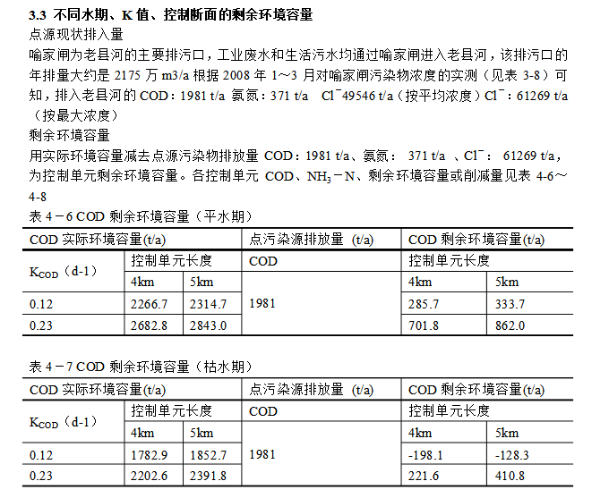 理想環(huán)境容量中扣除非點(diǎn)源污染物入河量后為實(shí)際環(huán)境容量,污染源調(diào)查中調(diào)查了老縣河匯水區(qū)面積、徑流量、徑流水質(zhì),并計(jì)算了面源污染物入河量(見(jiàn)表3-7),將整個(gè)匯水區(qū)內(nèi)(65km)面源污染物入河量按比例折算為控制單元內(nèi)面源污染物入河量,各控制單元理想環(huán)境容量扣除相應(yīng)面源入河量得到各控制單元實(shí)際環(huán)境容量。見(jiàn)表4-3.