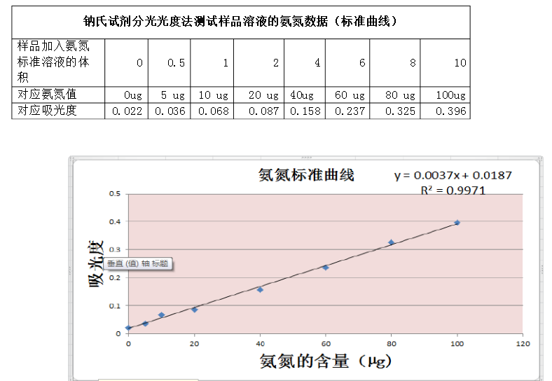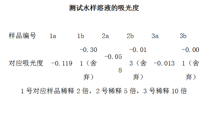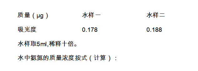 As——水樣的吸光度; Ab——空白試驗(yàn)的吸光度; a——校準(zhǔn)曲線的截距; b——校準(zhǔn)曲線的斜率; V——試料體積,ml。結(jié)果:水樣氨氮的質(zhì)量濃度:ρN1=7.4216mg/L、ρN2=7.962mg/L 平均的質(zhì)量濃度:ρN=7.6918mg/L