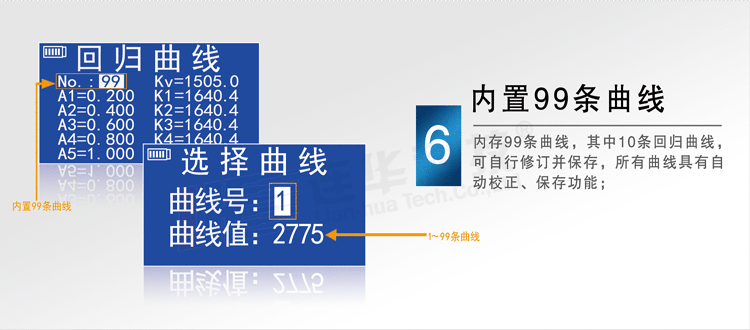 (07) 內存99條曲線,其中10條回歸曲線,可自行修訂并保存,所有曲線具有自動校正、保存功能;